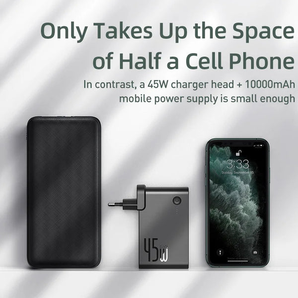 Stay powered up with the Baseus GaN Power Bank Charger, featuring a 10,000mAh capacity and 45W USB-C PD fast charging. This versatile 2-in-1 device combines a power bank and charger into a single unit, offering both charging and battery backup functionality. Ideal for a wide range of devices, including iPhone 11 Pro, laptops, and Xiaomi products, it delivers rapid and efficient charging to keep your devices powered. The advanced GaN technology ensures compact size and efficient power conversion, while the multiple ports provide flexible charging options.
